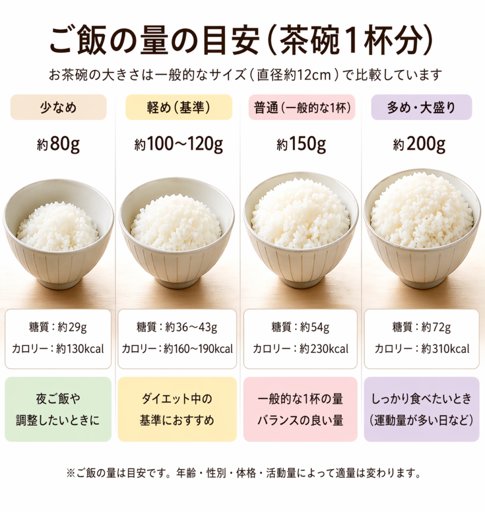 ではどのくらいが適量かというと、目安は「1食あたりお茶碗軽め1杯(約120〜150g)」です。
